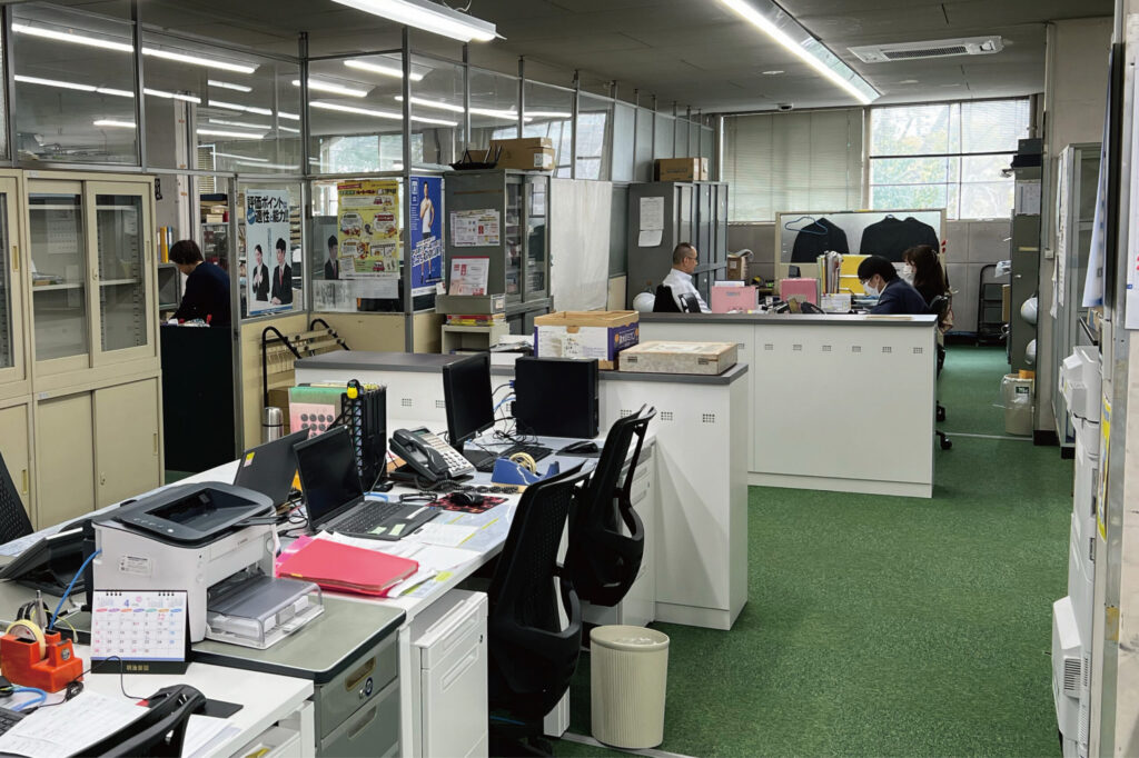 改修工事により、これまでコンクリートがむき出しだった2階事務所のすべての床面が、緑色のタイルカーペット張りへと生まれ変わりました。